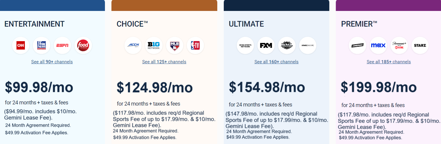 Max, Cinemax, SHOWTIME, STARZ, and MGM+ are included for 3 months and auto-renew thereafter at then prevailing rates (currently $14.99/mo. for Max, $11/mo. each for Cinemax, SHOWTIME and STARZ and $6/mo. for MGM+), unless you call to change or cancel. Req’s you to select offer. Offer subject to change & may be modified or discontinued at any time without notice.